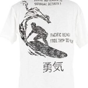 100% CottonRound neckWhite with Black logo, characters and surfer print. Japanese characters on the front mean: "strength" Tsuyo. Marks on back thigh mean: "courage" or "courage" Yūki.