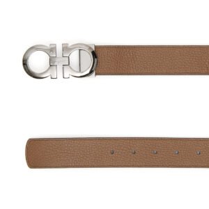 Salvatore Ferragamo reversible belt in grained calf leather with the iconic Double Gancio buckle in ruthenium-finished metal with engraved logo.