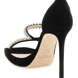 Jimmy Choo's "Bing" sandals made of suede leather and featuring crystal-studded straps. Adjustable ankle strap, leather footbed and leather sole.