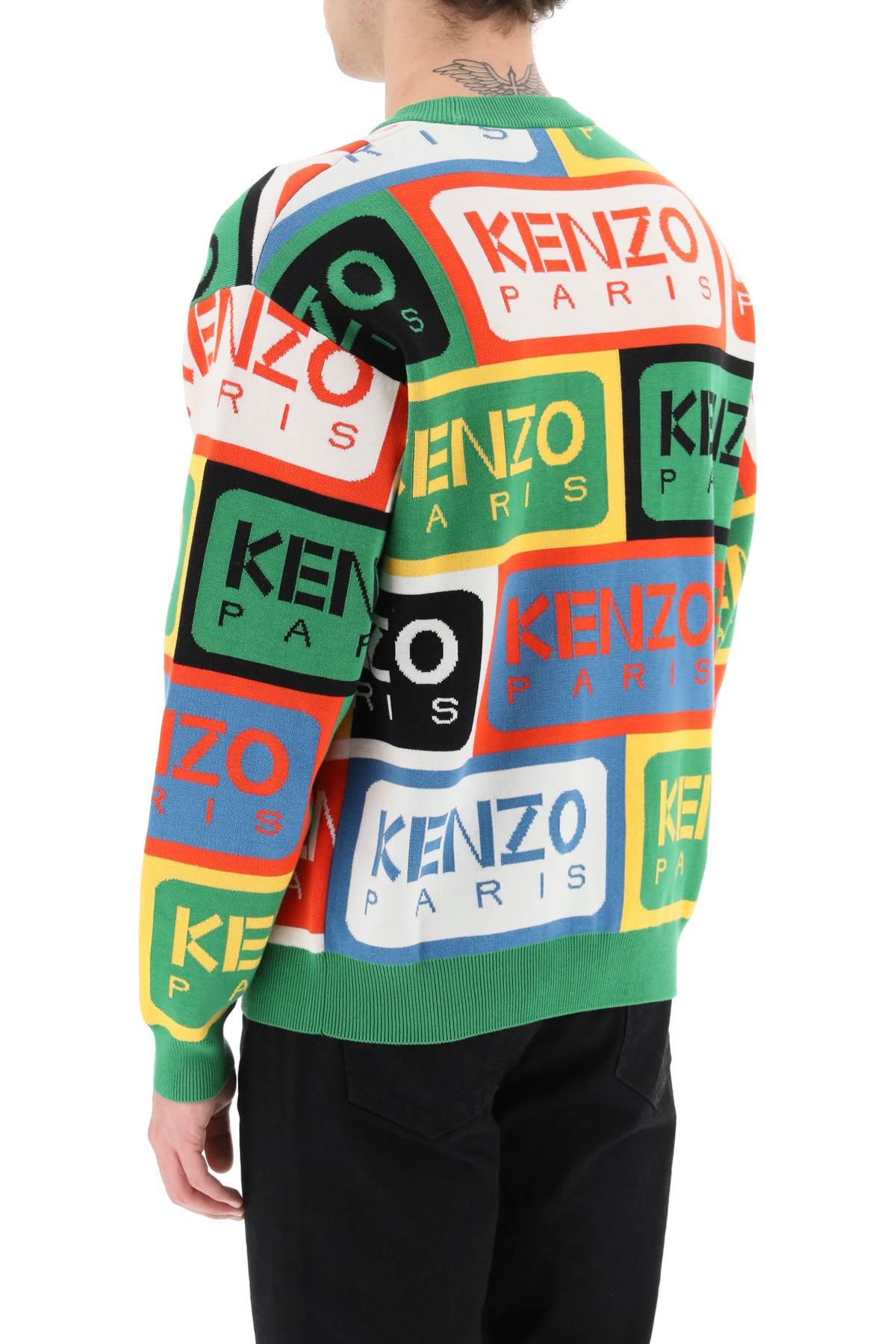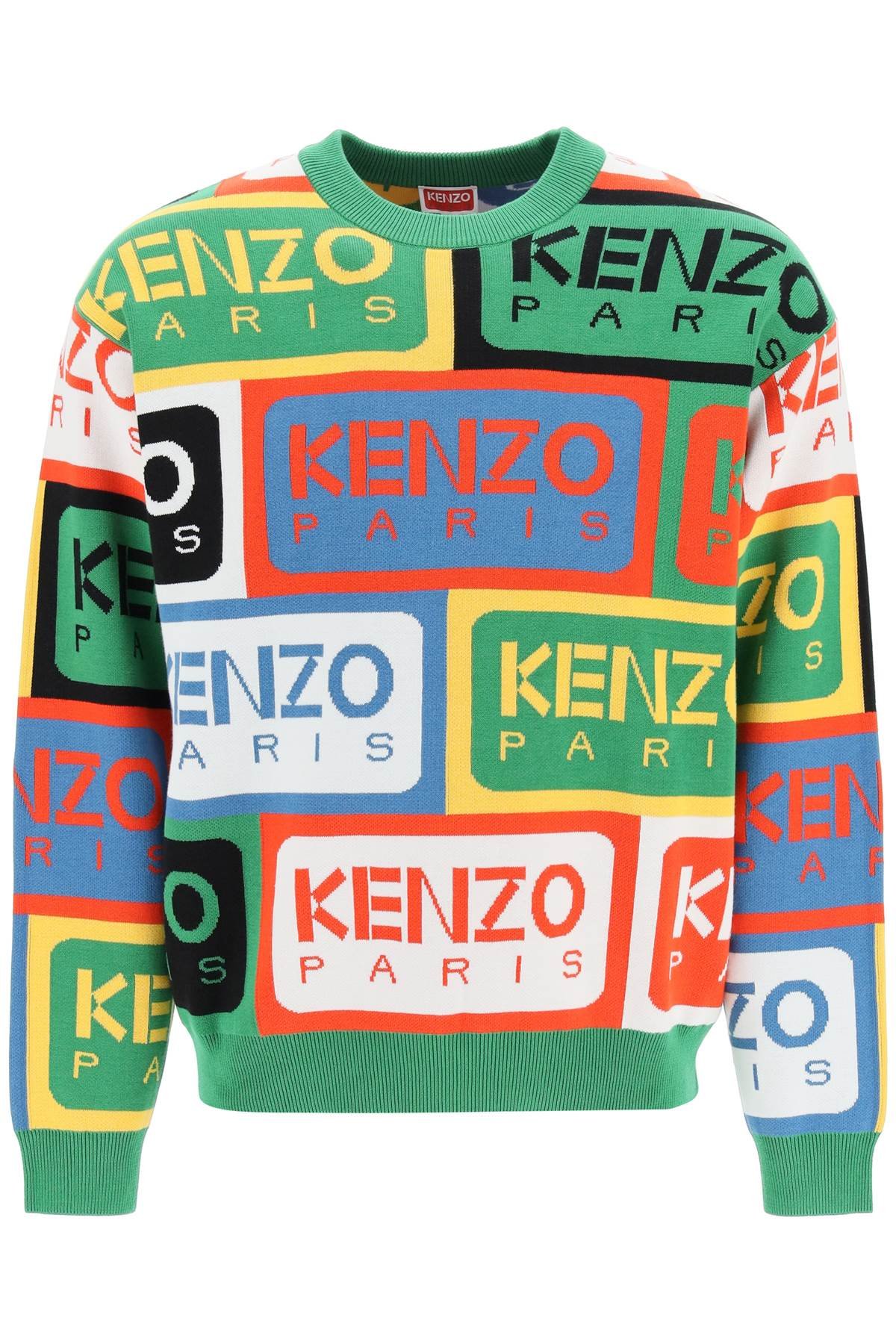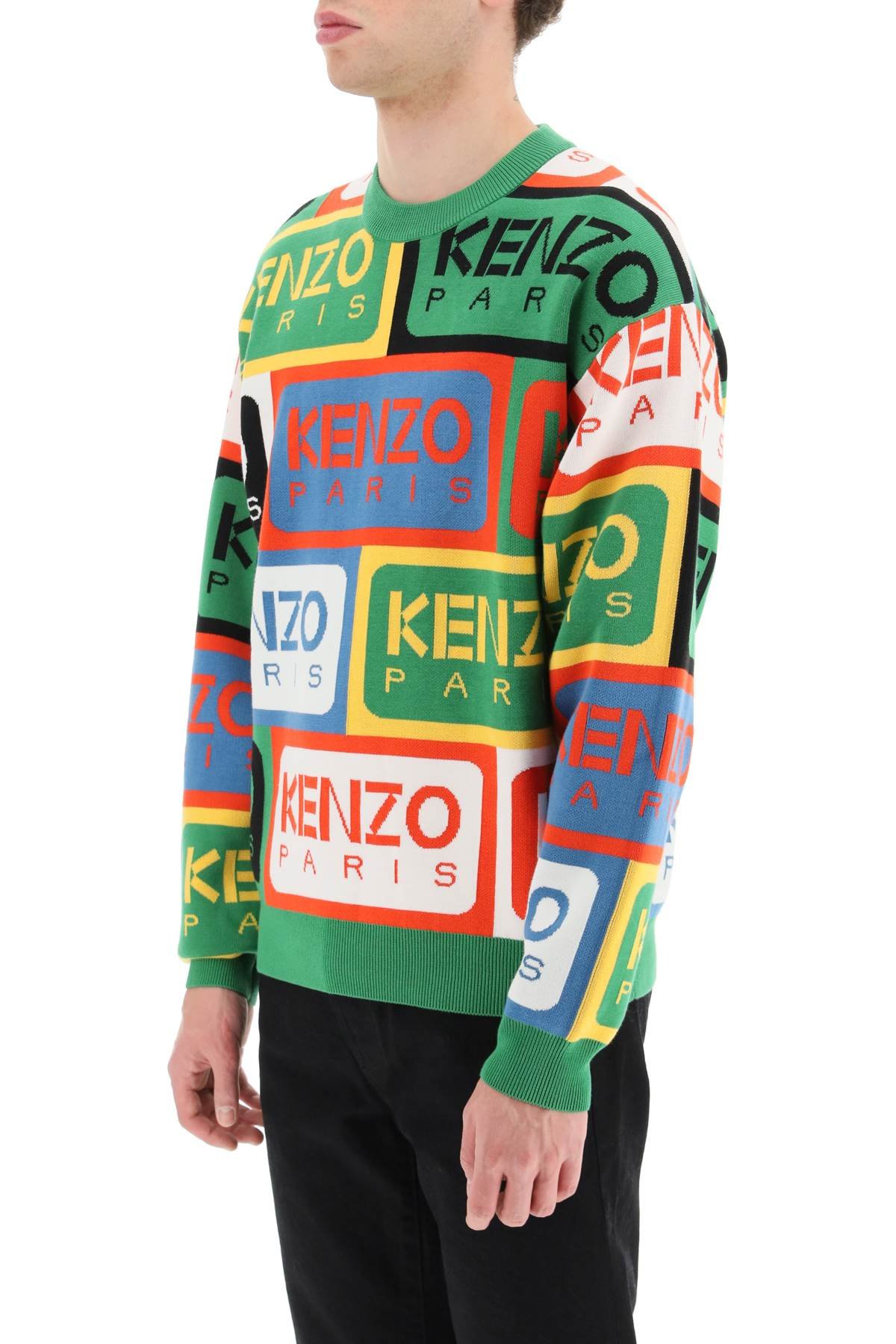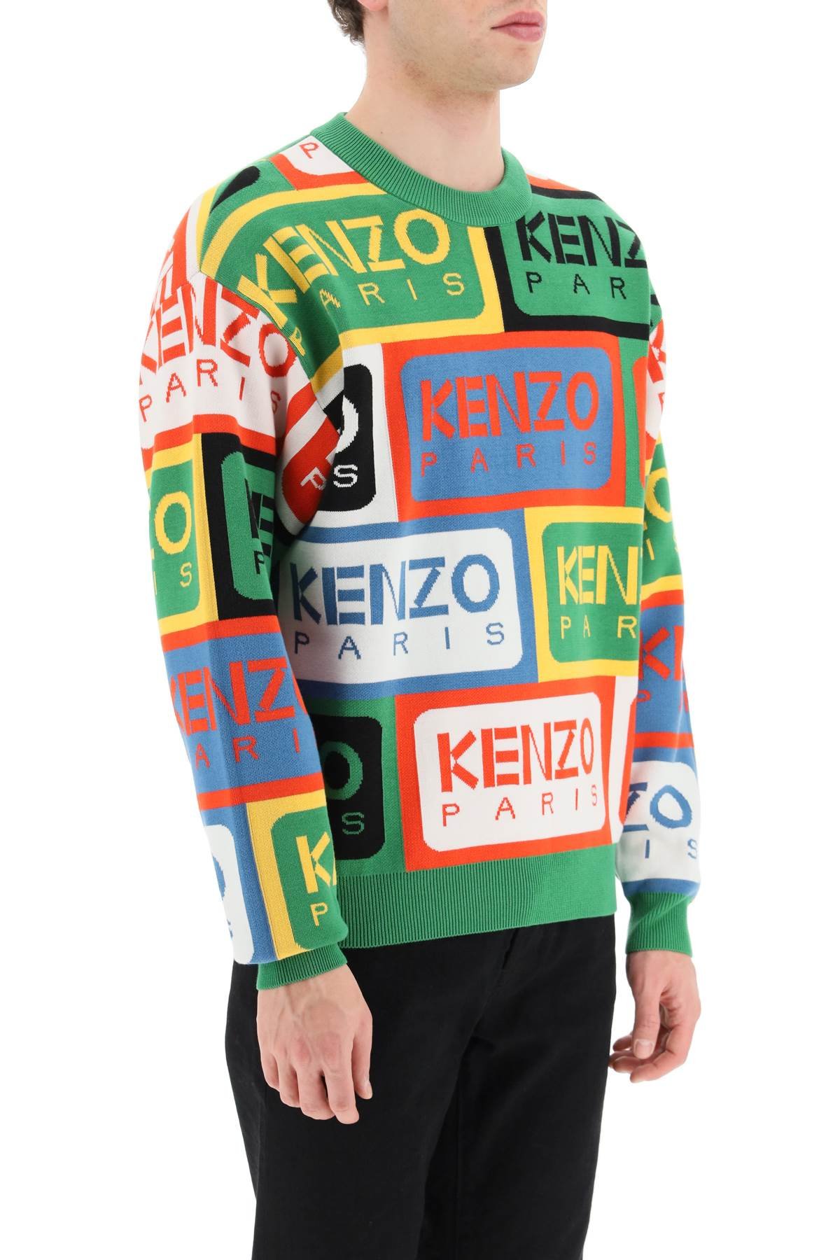 Crewneck organic cotton pullover by Kenzo featuring ribbed trims. It is characterized by all-over multicolor "Kenzo labels" motif jacquard. Loose fit. The model is 187 cm tall and wears a size M.