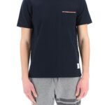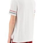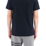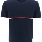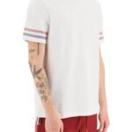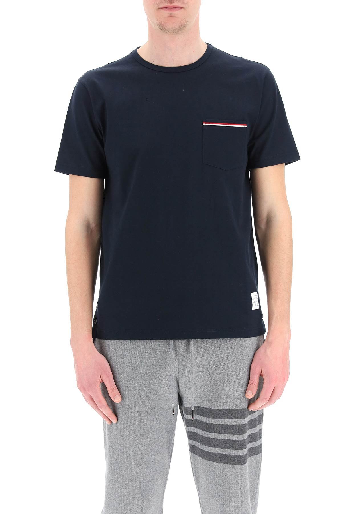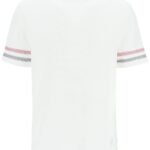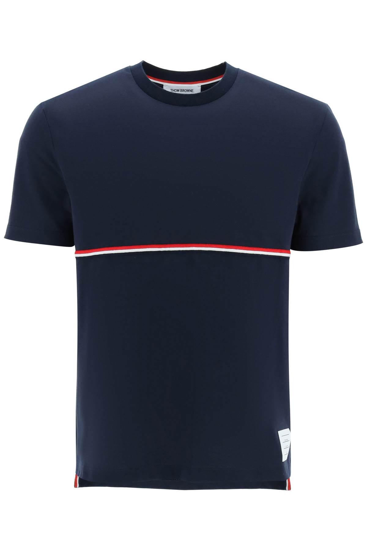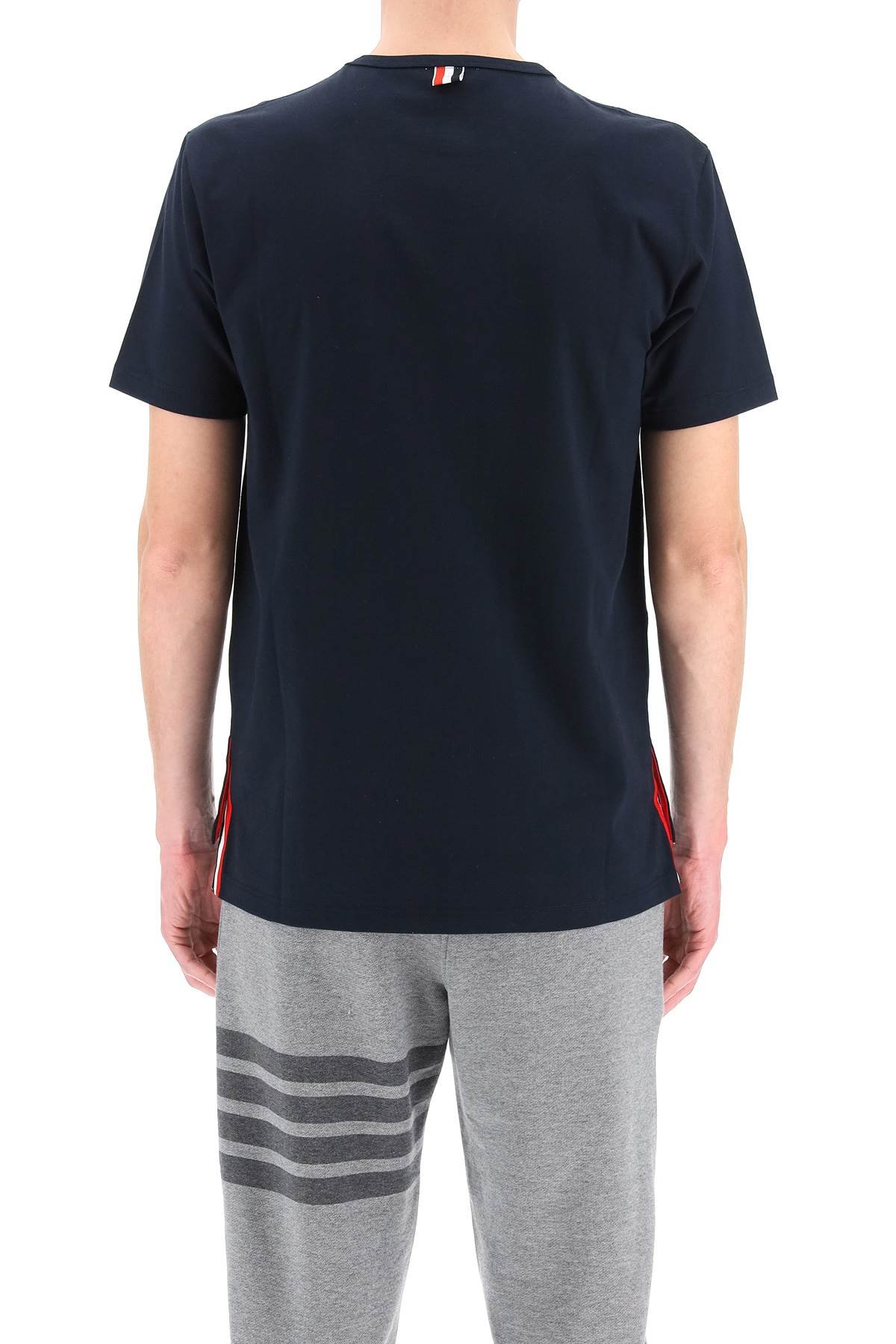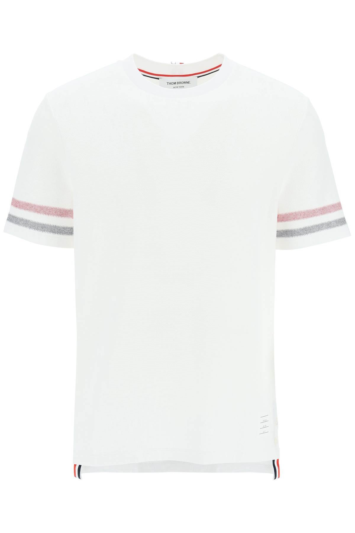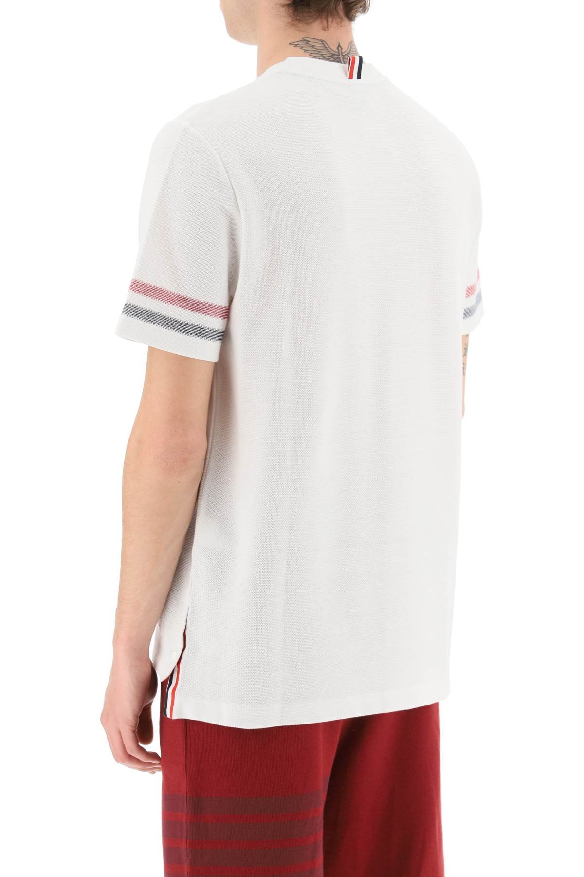 Thom Browne textured cotton t-shirt enhanced by an engineered stripe detail on both sleeves. The slightly dropped back hem reveals the signature tricolor grosgrain trim inside the buttoned side slits. Ribbed crew neck with the distinctive tab on the back, name tag on the lower front. Regular fit. The model is 187 cm tall and wears a size 3 Thom Browne.