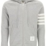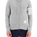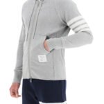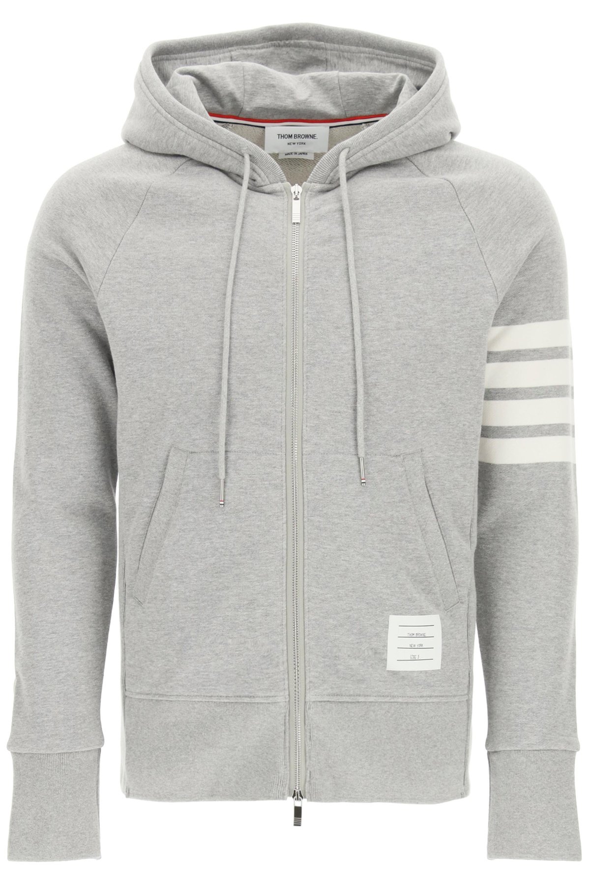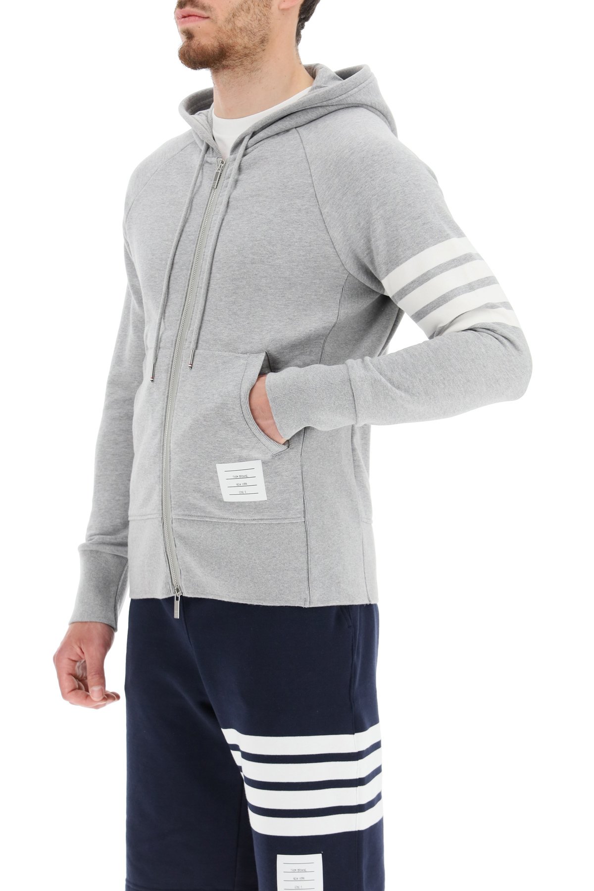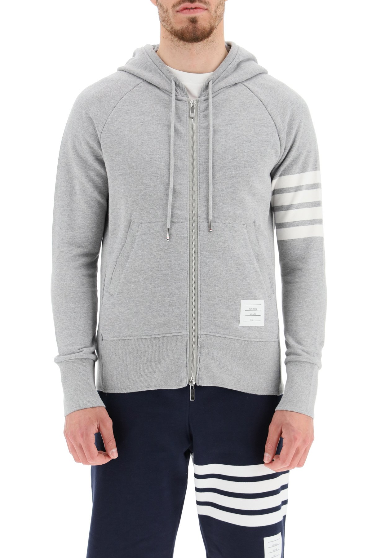 Thom Browne zip-up hoodie with drawstring hood in cotton jersey with signature 4-Bar stripes on a sleeve. Two-way zip closure, kangaroo pockets, ribbed stretch cuffs and hem, drawstring hood. Tricolour grosgrain loop on the upper back. The model is 185 cm tall and wears a size 3 Thom Browne.